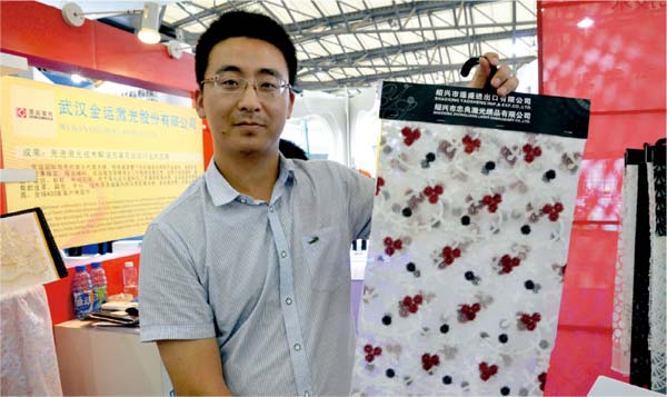 金運(yùn)激光的負(fù)責(zé)人展示用激光技術(shù)加工的花紋面料