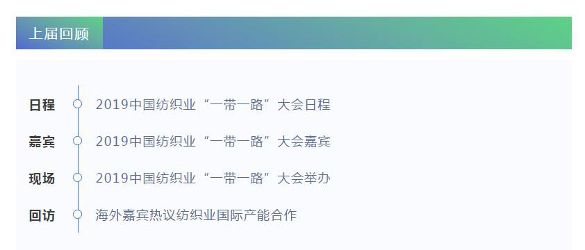 本屆大會以“可持續(xù)的貿易投資雙循環(huán)”為主題,將邀請國內相關政府部門與行業(yè)協(xié)會代表、“一帶一路”沿線國家相關政府部門、紡織商協(xié)會代表,以及國內領軍紡織企業(yè)家等業(yè)界人士,共同探討“雙循環(huán)”格局下的中國紡織業(yè)“一帶一路”貿易投資前景,攜手規(guī)劃產業(yè)國際合作可持續(xù)發(fā)展的宏遠未來。