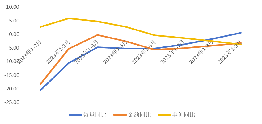 圖2. 2023年1-9月我國家用紡織品出口金額、數(shù)量、單價同比變化