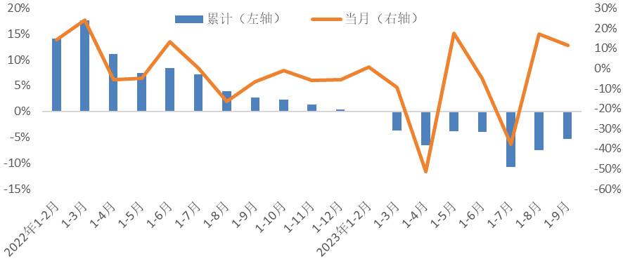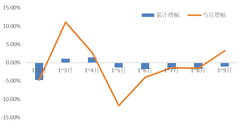 圖4.2023年1-9月家紡規(guī)模以上企業(yè)內(nèi)銷產(chǎn)值增長走勢