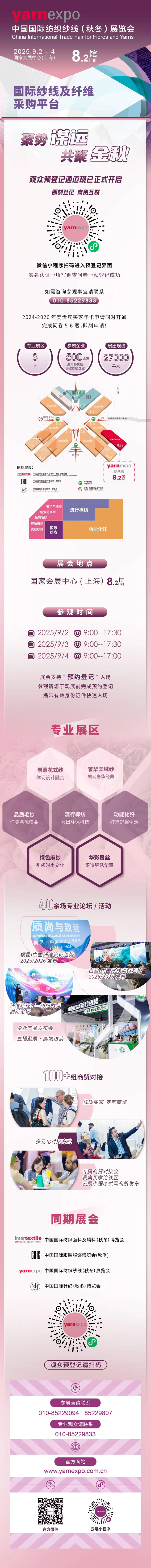 您現(xiàn)在的位置是:首頁 > 要聞 2025Yarn Expo秋冬紗線展 | 9月相聚上海,觀眾預(yù)登記上線 來源:yarnexpo紗線展 發(fā)布日期:2025-07-15 字體: 【小】 【中】 【大】 分享: 熱門文章: 展商專訪|金三發(fā)集團(tuán)·優(yōu)全股份亮相CINTE25 展示非織造... [2025-07-15] 9月上海見!2025Intertextile 秋冬面輔料展觀... [2025-07-14] 出口快訊 | 上半年全國紡織品服裝出口1439.8億美元,同... [2025-07-14] 展會服務(wù) | CINTE25展商邀請客戶系統(tǒng)上線 [2025-07-11] 出訪〡共拓拉美紡織新篇(洪都拉斯) [2025-07-11] 展會直通車