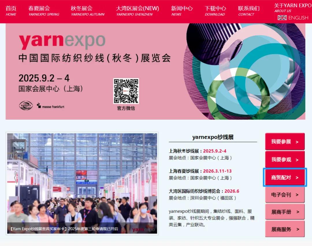 只要您有采購纖維紗線產(chǎn)品意向,希望快速找到心儀的產(chǎn)品,便可通過主辦方【商貿(mào)配對(duì)】預(yù)約服務(wù)系統(tǒng)進(jìn)行申請(qǐng)。