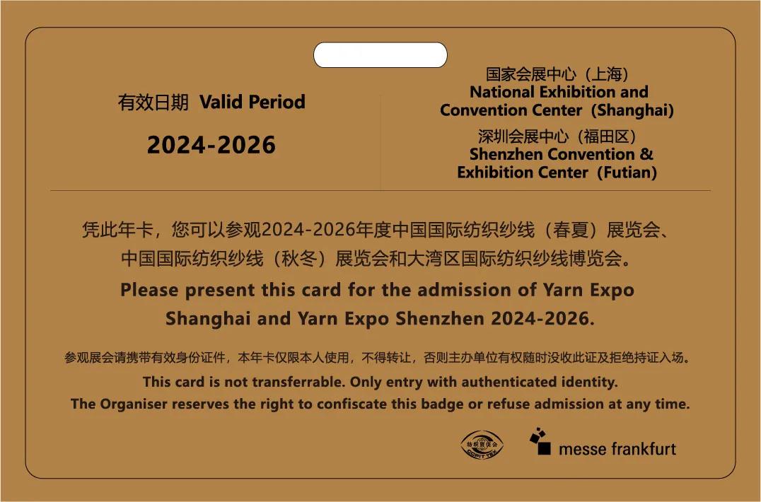 Yarn Expo紗線展貴賓買家年卡是Yarn Expo紗線展組委會(huì)為專業(yè)觀眾提供的特別服務(wù)。貴賓買家年卡三年為一個(gè)有效周期,本周期即在2024至2026年三年內(nèi),持卡觀眾可憑此卡參觀2024-2026年度中國(guó)國(guó)際紡織紗線(春夏)展覽會(huì)、大灣區(qū)國(guó)際紡織紗線博覽會(huì)、中國(guó)國(guó)際紡織紗線(秋冬)展覽會(huì),并享受主辦方為您提供的系列專屬服務(wù)。