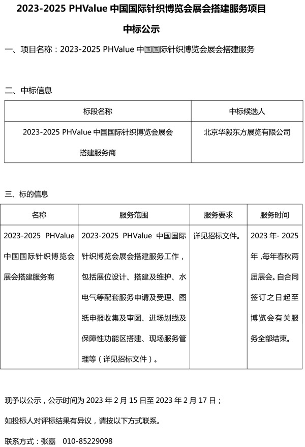 您現(xiàn)在的位置是:首頁 > 最新公告 2023-2025 PHValue中國國際針織博覽會展會搭建服務項目中標公示 來源:紡織貿(mào)促會 發(fā)布日期:2023-02-15 字體: 【小】 【中】 【大】 分享: 熱門文章: 2025intertextile春夏 | “友禮”同享齊觀展... [2025-02-19] 2024年我國紡織行業(yè)經(jīng)濟運行總體平穩(wěn) [2025-02-17] 聚焦綠色智慧融合 展示產(chǎn)業(yè)用紡織品新趨勢 [2025-02-11] 響應政策 落實服務 | PH Value義烏展全力“備戰(zhàn)”中 [2025-02-11] 【亮星季】第一期正式開啟 | 商貿(mào)先行,品質(zhì)好禮享不停 [2025-02-10] 展會直通車